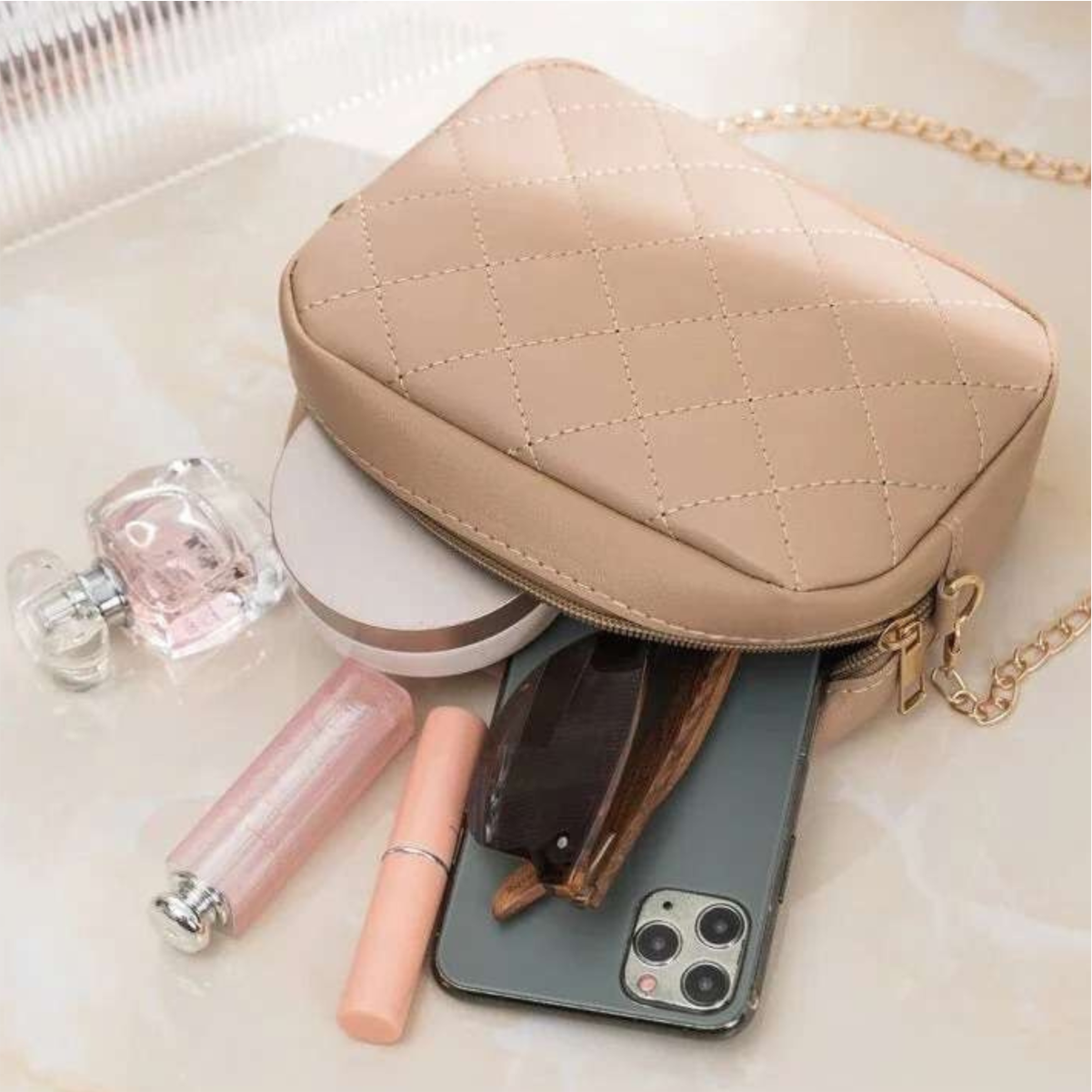 Crafted with a long gold chain for that extra touch of elegance, this bag effortlessly elevates any outfit. Compact yet spacious enough to carry your essentials, it’s the ultimate blend of fashion and functionality.